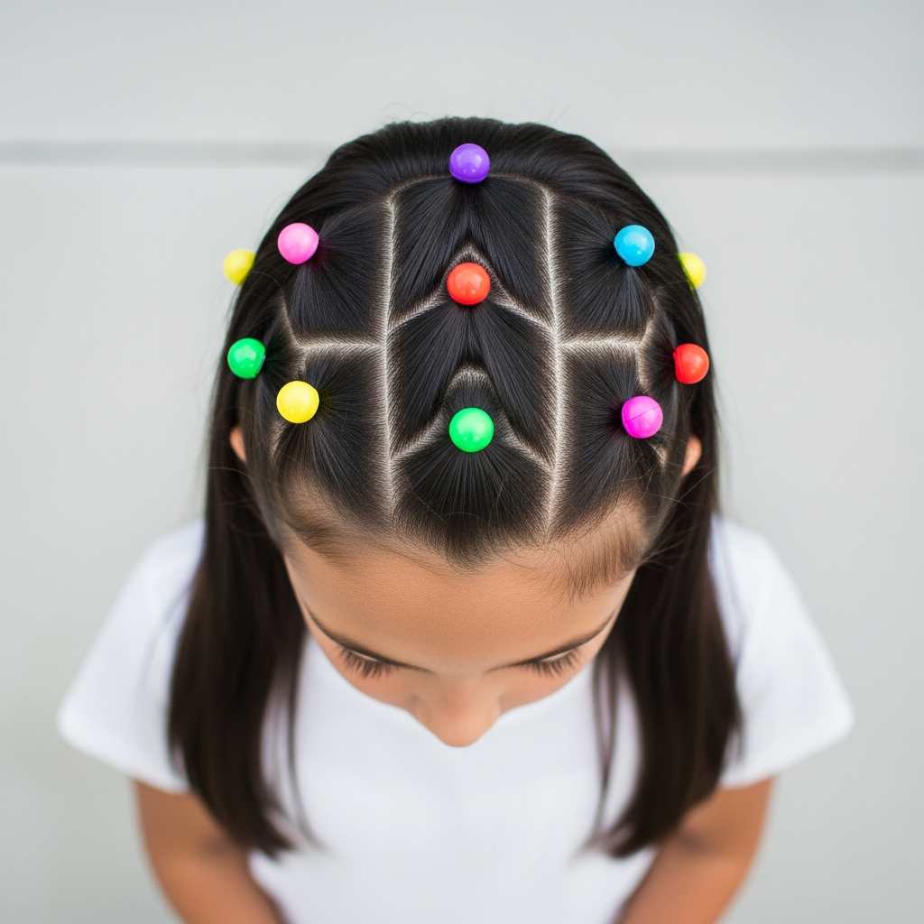 Create a zigzag part down the center using a rat-tail comb, making the zigzag pattern bold and visible. Brush hair smooth on both sides, then clip small ball ornament clips (plastic, never glass!) at each point of the zigzag. Choose ornaments in coordinating colors for maximum impact.
