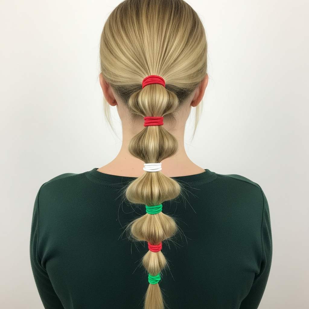 Create a low ponytail at the nape, then add elastics every 2-3 inches down the length of the ponytail. Gently pull each section apart to create rounded “bubble” shapes. Use alternating colored elastics—red, then white, then green—for a festive candy-cane or Christmas light effect.