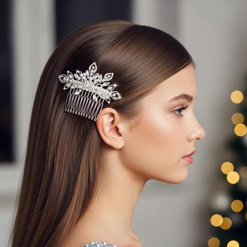 Brush all hair to one side and secure behind the ear with bobby pins, creating a smooth, elegant side-swept look. Place a decorative hair comb (featuring rhinestones, pearls, or Christmas motifs) at the point where hair is swept back, making it the statement piece of the style.