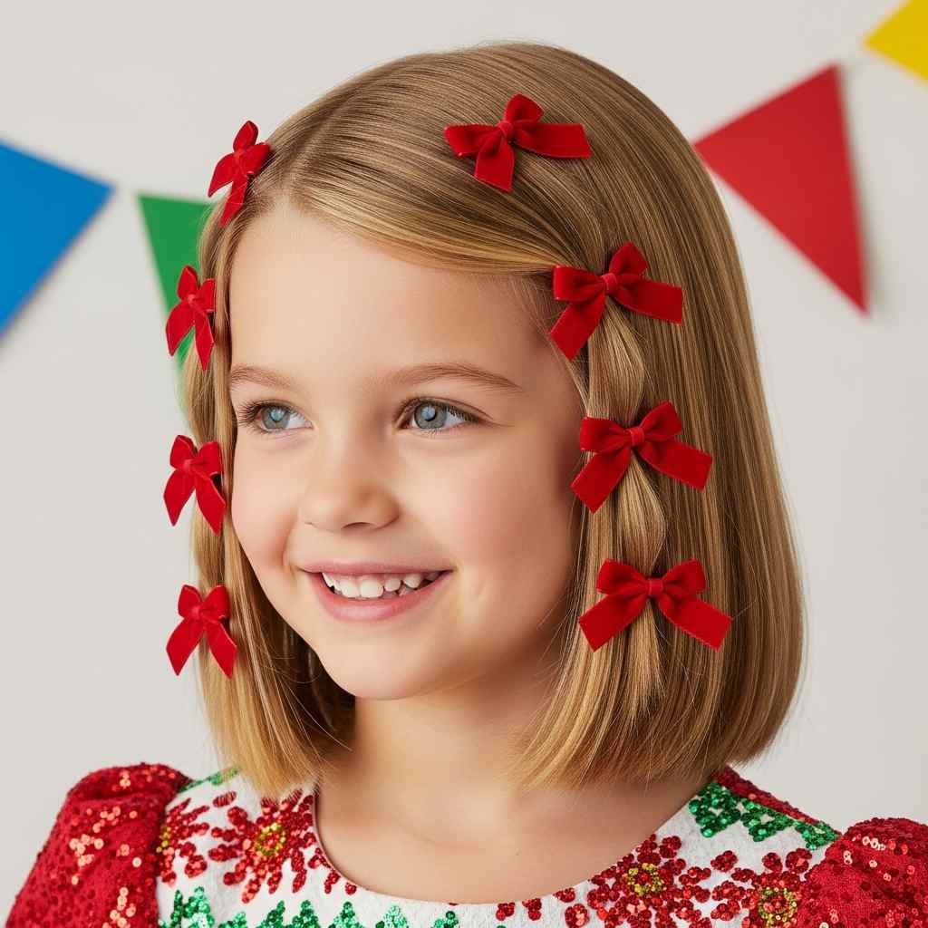 Instead of one large statement piece, scatter 5-7 small matching bows throughout loosely styled hair. Part hair naturally and clip mini bows randomly on both sides, creating a playful, confetti-like effect. Choose bows in coordinating Christmas colors—perhaps all red, mixed red and white, or a combination of plaid patterns.