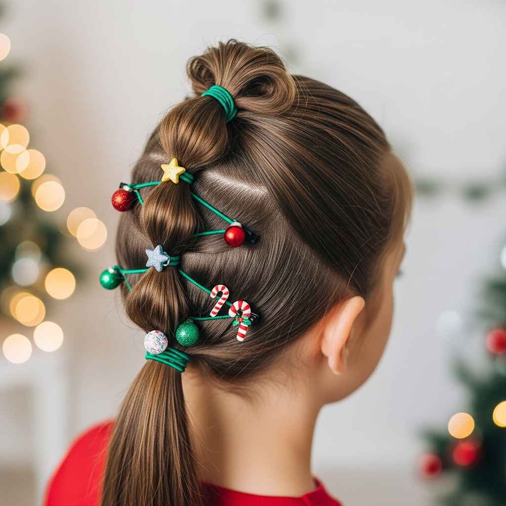 Create a vertical Christmas tree shape down the back of the head using a series of small ponytails. Start with a small ponytail at the crown, then create another just below it, incorporating the tail of the first ponytail. Continue down the head, creating 3-4 stacked ponytails. Use green elastics and clip small decorative elements like tiny bows or beads between each section as “ornaments.”