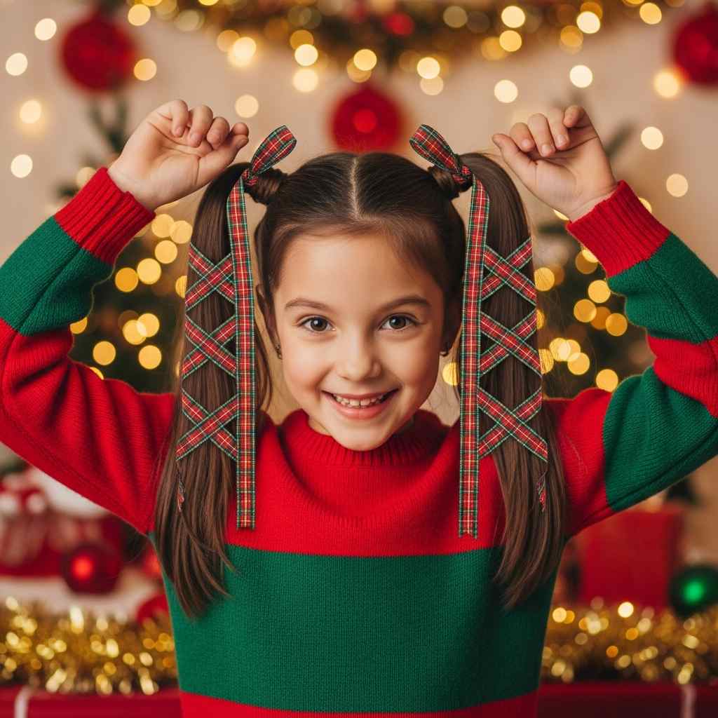 Create a simple three-strand braid starting at the temple and working down one side. At intervals, tie in small jingle bells using thin ribbon or attach them with small clips. The gentle jingling sound as your child moves adds an extra layer of festive fun!