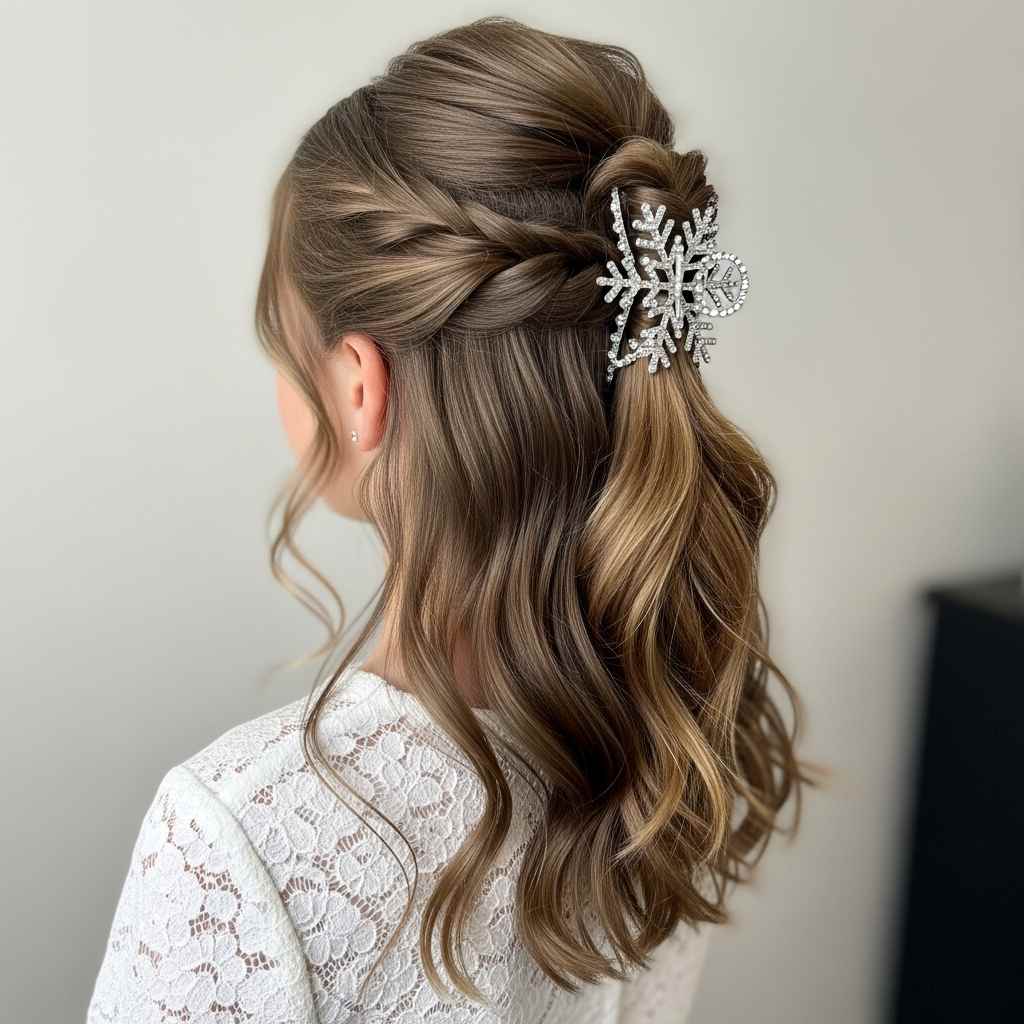 Gather the top section of hair from temples back, twist both sides gently, and secure together at the back crown with a decorative snowflake hair clip. Leave the bottom section loose and natural straight, wavy, or curly depending on your child’s hair type.