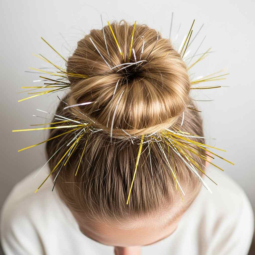 Gather all hair into a high ponytail, twist loosely, and wrap around the base to create a casual messy bun. Secure with bobby pins, allowing some pieces to stick out naturally for that perfectly imperfect look. Weave thin pieces of Christmas tinsel through the bun randomly for sparkle.