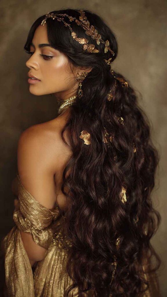 Deep, luxurious waves in rich chocolate or mahogany tones, with gold leaf flakes artistically placed throughout the hair. This opulent style channels ancient Greek goddesses celebrating Saturnalia, the winter solstice festival.