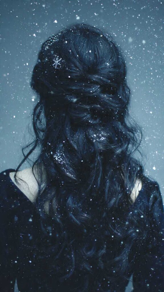 The top half of hair is twisted and pinned back, while the bottom half flows in dark waves. White or silver cosmetic snowflake confetti is scattered throughout the dark hair, creating the illusion of gentle snowfall against a night sky.