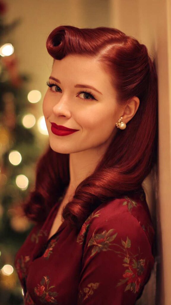 Victory rolls or pin curls styled at the front hairline with the rest of the hair in smooth, glossy waves. The hair is colored in deep crimson red, reminiscent of luxurious velvet Christmas ribbons and for kids, creating a stunning 1940s-inspired holiday look.