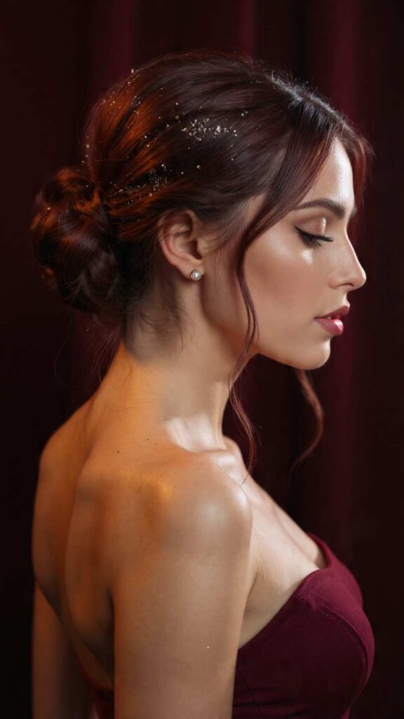Deep, rich burgundy or black hair swept into an elegant low chignon, with the roots and edges dusted with fine gold cosmetic glitter. This sophisticated style embodies the luxury of velvet Christmas ornaments and captures the opulence of holiday celebrations.