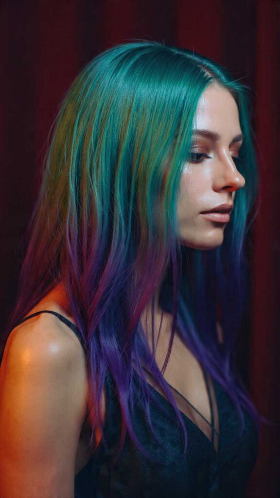 This bold, artistic approach features temporary hair color in shades of deep emerald green, sapphire blue, and violet purple that blend seamlessly together, mimicking the aurora borealis dancing across the night sky. The colors are applied in a horizontal gradient from dark roots to lighter, more vivid ends.
