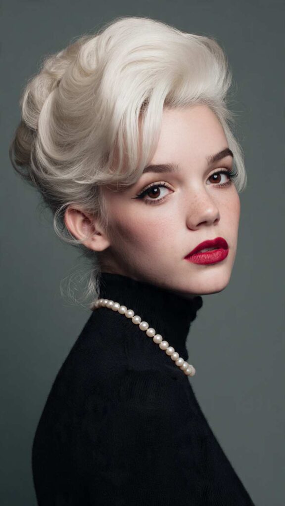 Inspired by vintage holiday desserts, this voluminous style features a high, teased bouffant with smooth, creamy texture. The hair is styled in soft platinum or champagne blonde tones, with the crown area dramatically elevated and the rest flowing in gentle waves.