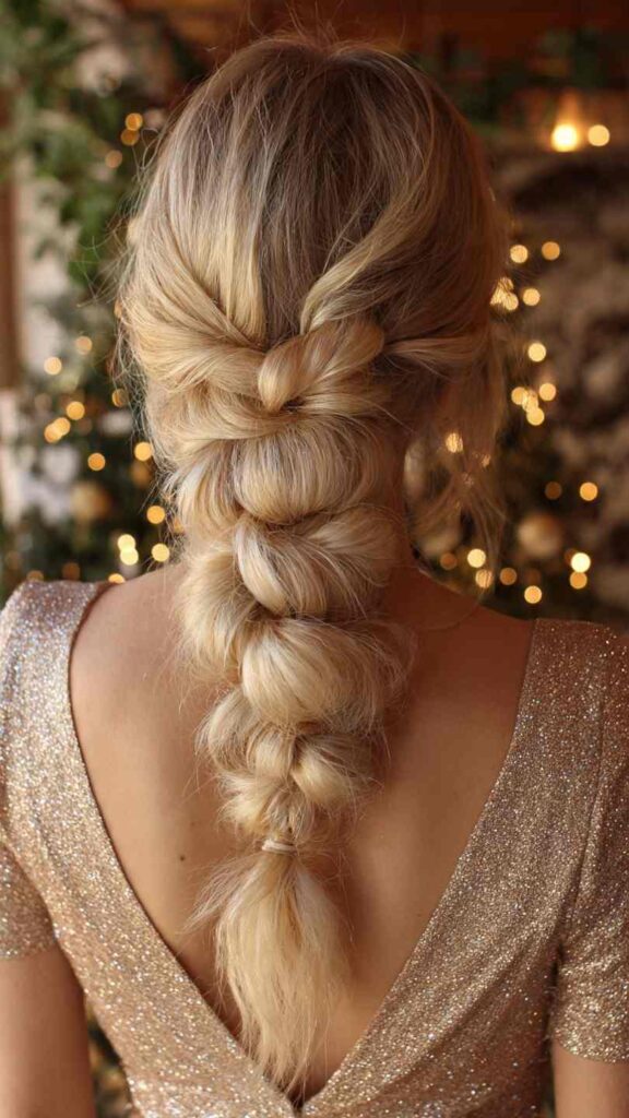 For Holiday Office Parties: Strike a balance with the Frosted Crystal Waves, Champagne Bubble Braid, or Metallic Ombrรฉ Ponytail. These are festive enough to show holiday spirit while remaining workplace-appropriate.