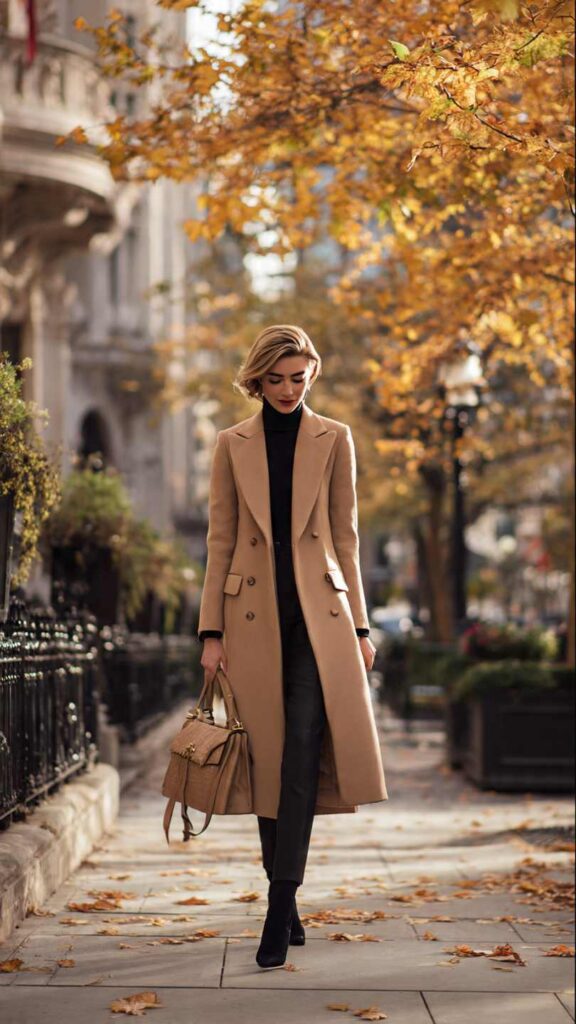A structured, knee-length wool coat in classic camel becomes your signature outerwear. Look for quality fabric, classic notched lapels, and a fit that layers over sweaters without tightness. This coat works over everything from jeans to dresses.
