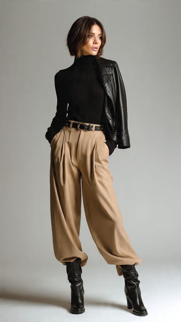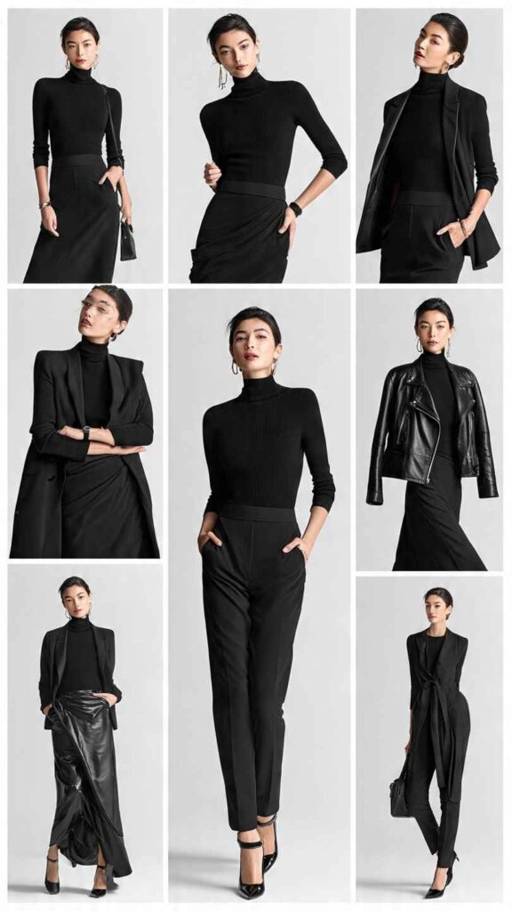 A fine-knit black turtleneck in merino wool or quality cotton blend provides sleek warmth. Choose a fitted or semi-fitted style that layers well under blazers and coats.