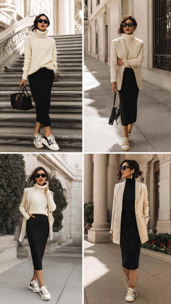 High-waisted, well-fitting black trousers in quality fabric provide professional foundation. Choose a modern cutโwide-leg or straightโthat flatters your body. Quality fabric that doesn’t wrinkle is essential.