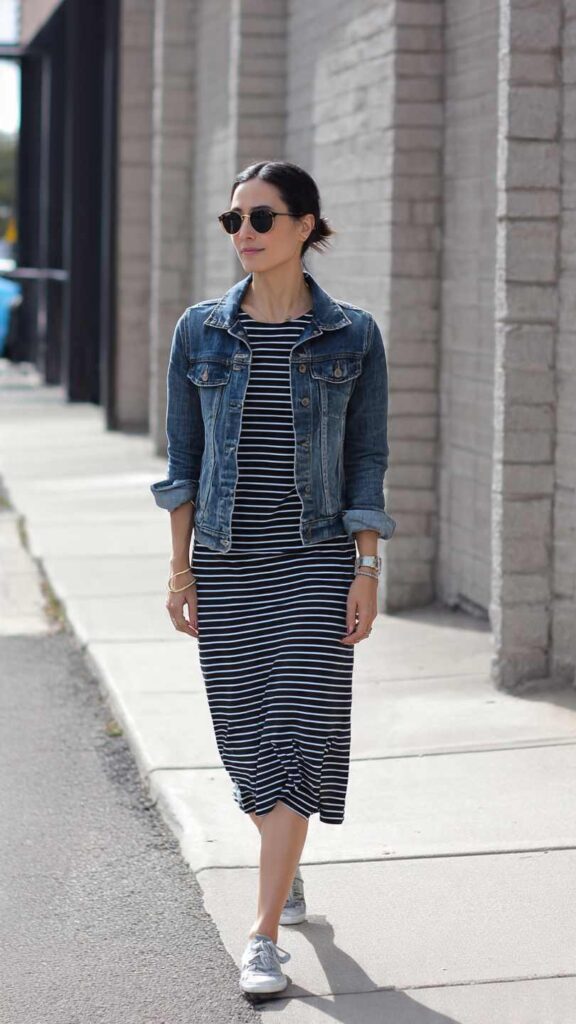A medium-wash denim jacket provides casual layering. Choose quality denim with some stretch for comfort. The fit should be slightly cropped to work over dresses and with high-waisted bottoms.