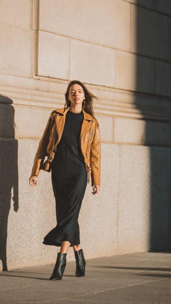 A classic moto-style or streamlined leather jacket in black adds edge to any outfit. Choose quality leather or convincing vegan leather that will last years. The jacket should fit close without being tight.