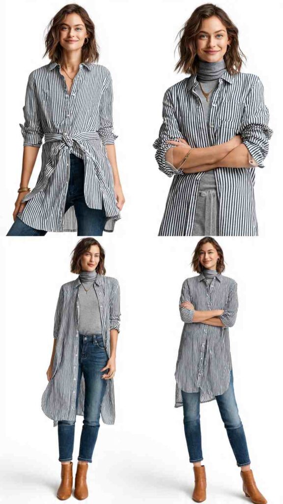 A long-sleeve shirt dress in neutral stripe, chambray, or solid provides casual polish. The button-front allows versatile stylingโworn open as a duster, belted for definition, or as a true dress.