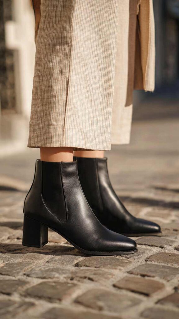 Black or brown leather ankle boots with a low block heel provide comfortable elegance. Choose quality leather that will last. The heel height should be walkable for your lifestyle.