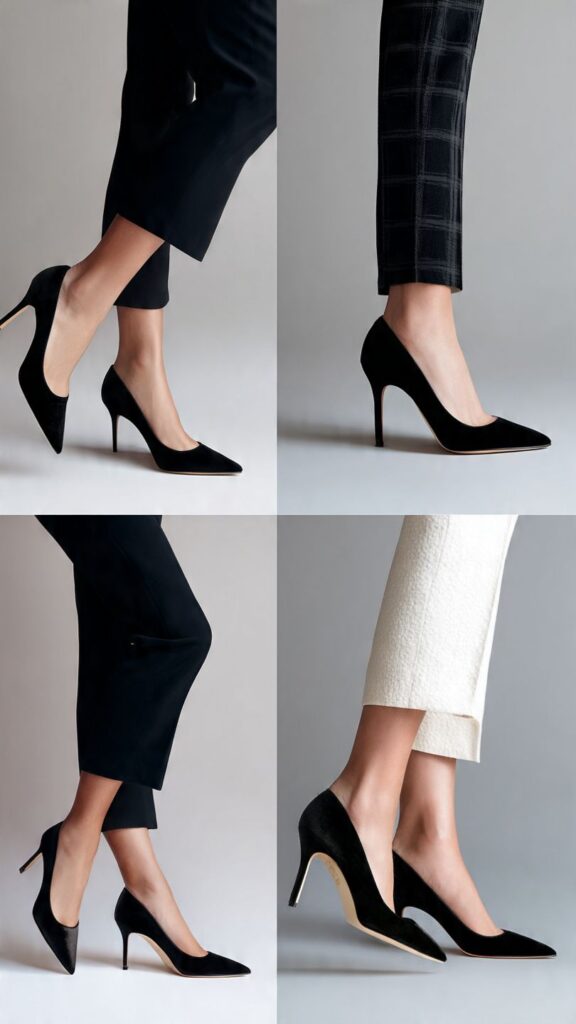 Classic black pumps with 2-3 inch heels provide dressed-up foundation. Choose a timeless styleโpointed or almond toe. Comfort is essentialโyou should be able to walk confidently.