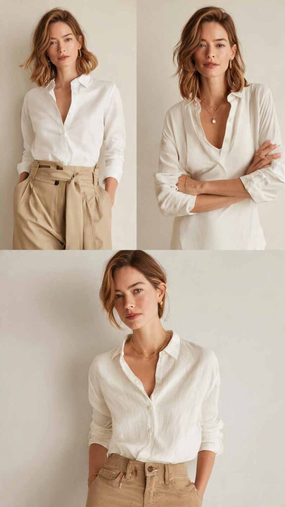 A crisp white cotton or linen button-down becomes your blank canvas. Choose quality fabric that doesn’t wrinkle excessively. The fit should be slightly oversized for modern stylingโtucked, half-tucked, or worn open as a layer.