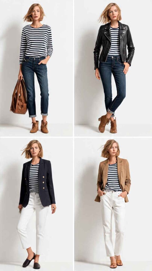 A classic Breton stripe or simple striped tee in navy and white brings casual polish. Choose quality cotton with some weight thin, cheap stripes look sloppy.
