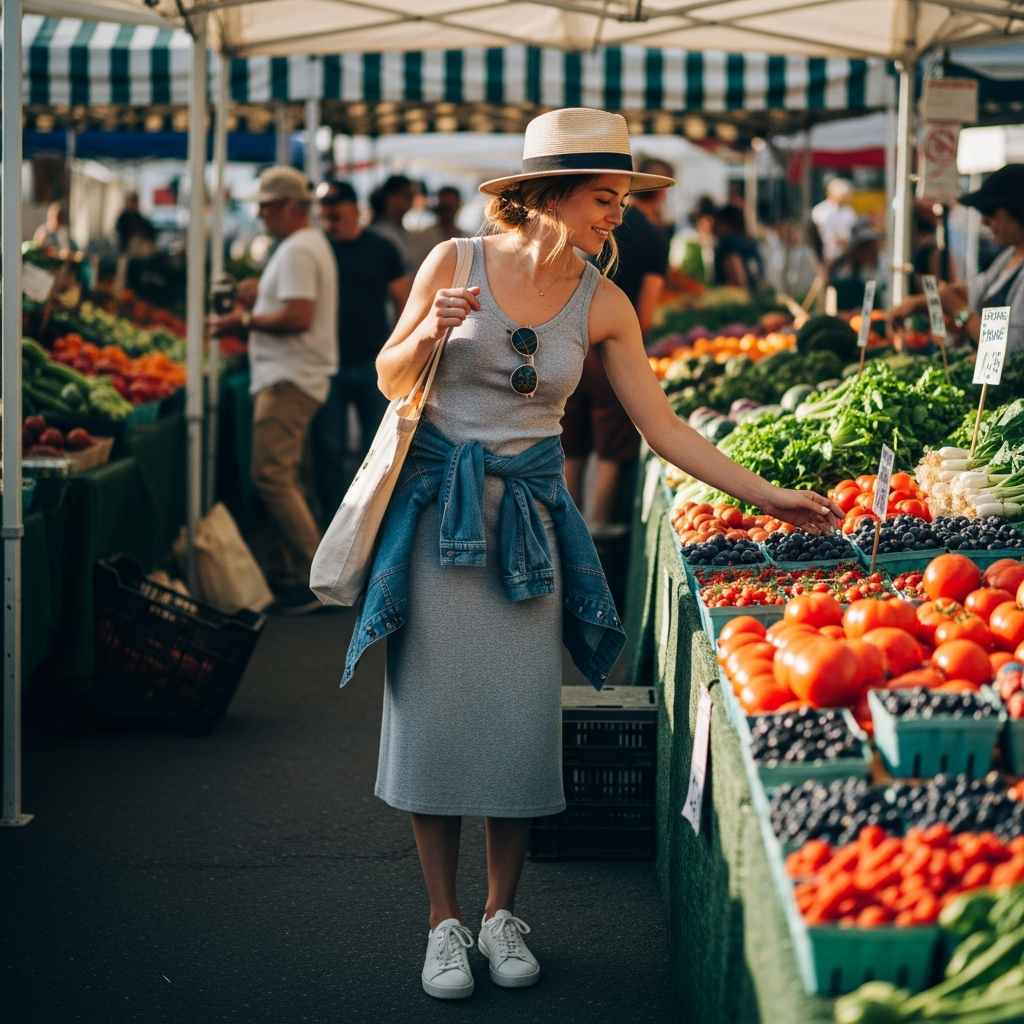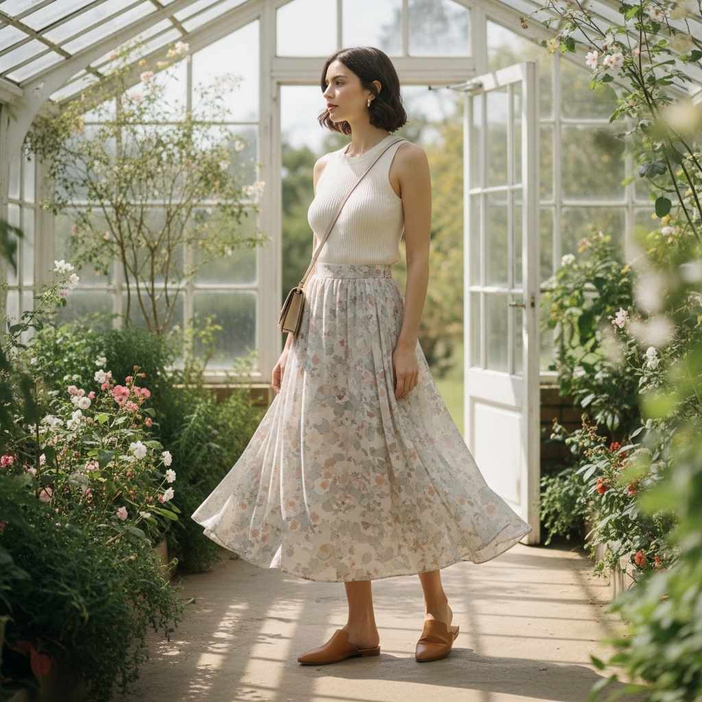 Choose a fitted ribbed knit tank in neutral tones paired with a flowy midi skirt in complementary colors or subtle patterns. The contrast between the fitted top and flowing bottom creates flattering proportions. Add simple sandals or mules, a crossbody bag, and minimal jewelry. This outfit works for casual dates, weekend lunches, or creative work environments with relaxed dress codes.