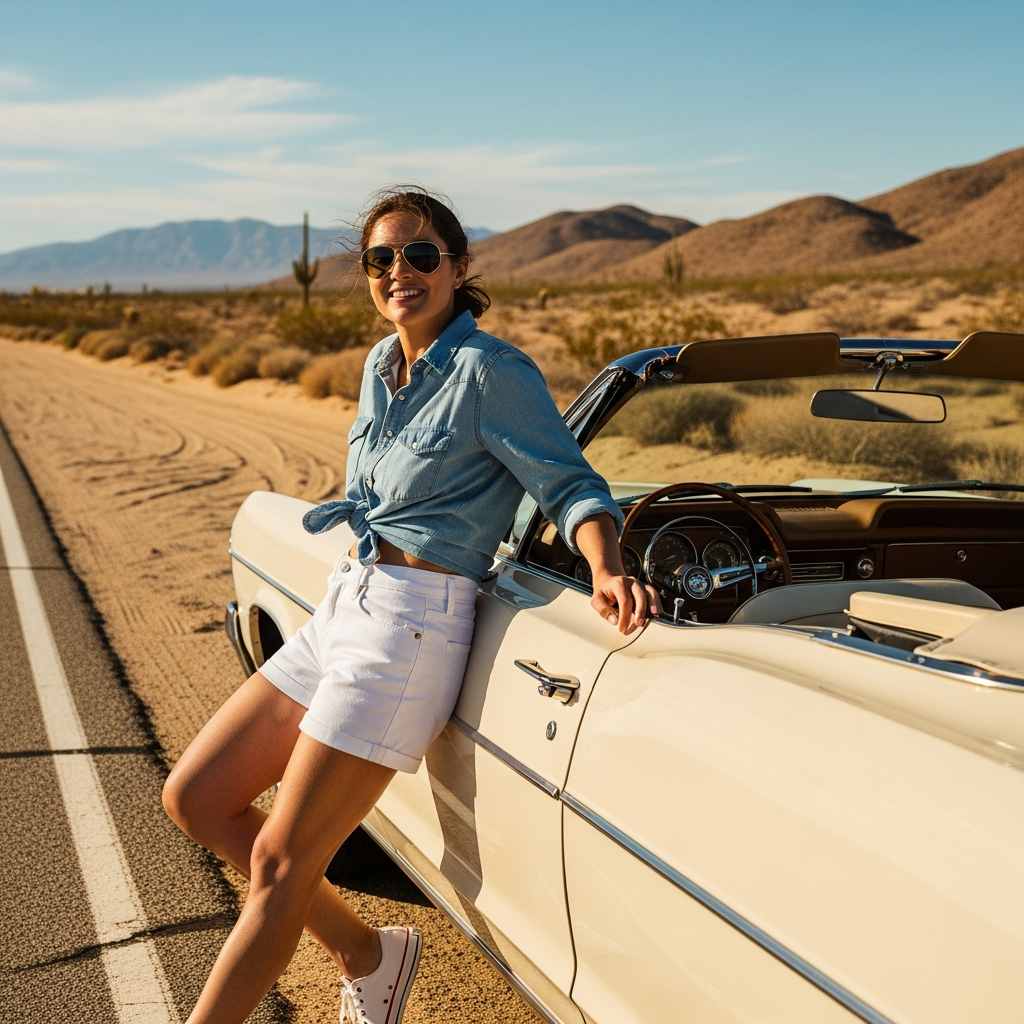 Pair a light-wash denim shirt (worn open or loosely buttoned) with denim shorts or a denim skirt in a slightly different wash for visual interest. Keep one piece fitted and one piece relaxed to avoid overwhelming the look. Add white sneakers or tan sandals, and keep accessories simpleโ€”maybe a bandana tied around your bag strap or worn as a hair accessory. This works for casual outings, road trips, or laid-back social gatherings.