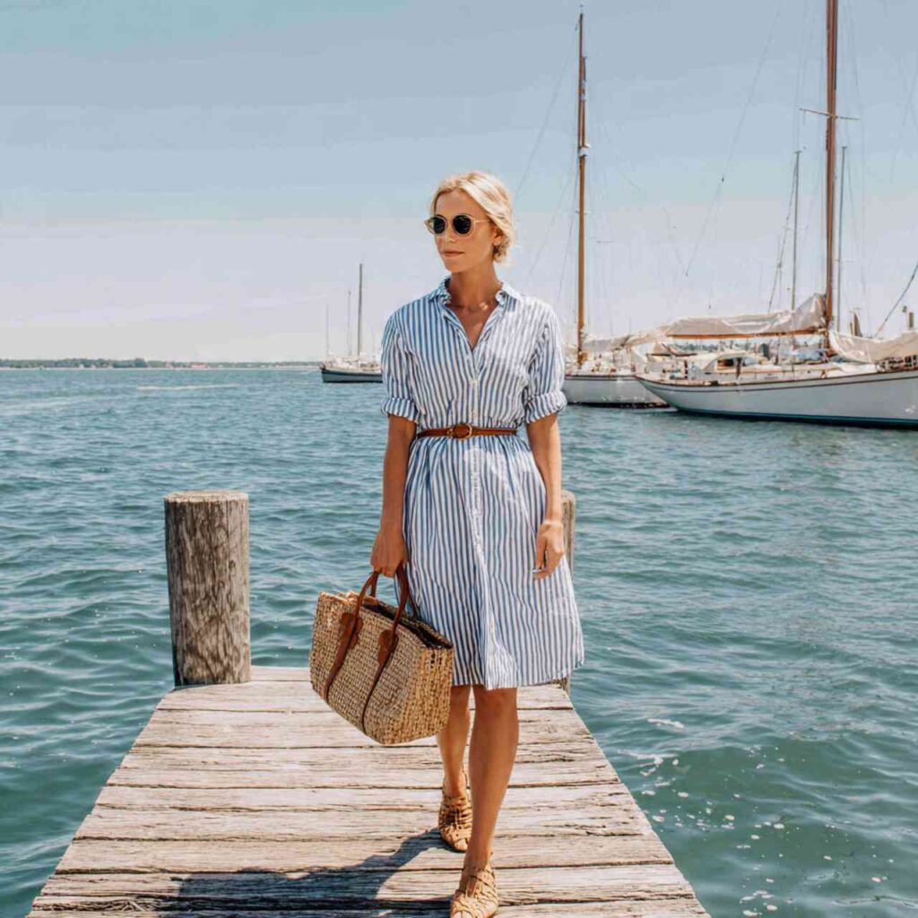 The shirt dress remains a summer staple for excellent reasons it’s one piece with complete outfit impact. A striped version adds visual interest while maintaining the classic shirt dress ease. This is the kind of piece you reach for when you need to look put-together with minimal effort.