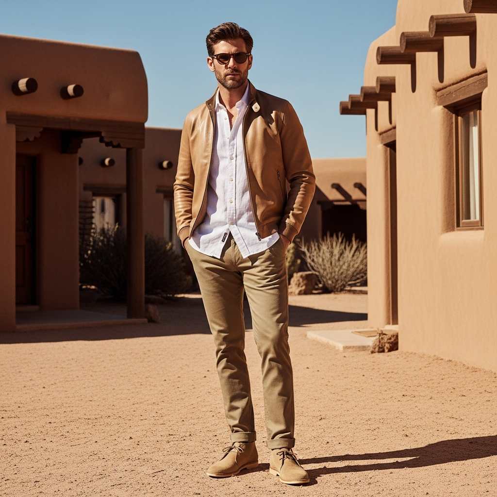 A tan or sand-colored leather jacket in bomber or trucker style over a white linen shirt, paired with khaki chinos and tan suede desert boots. This light, earthy palette creates a sophisticated spring or early fall look that feels fresh and unexpected.