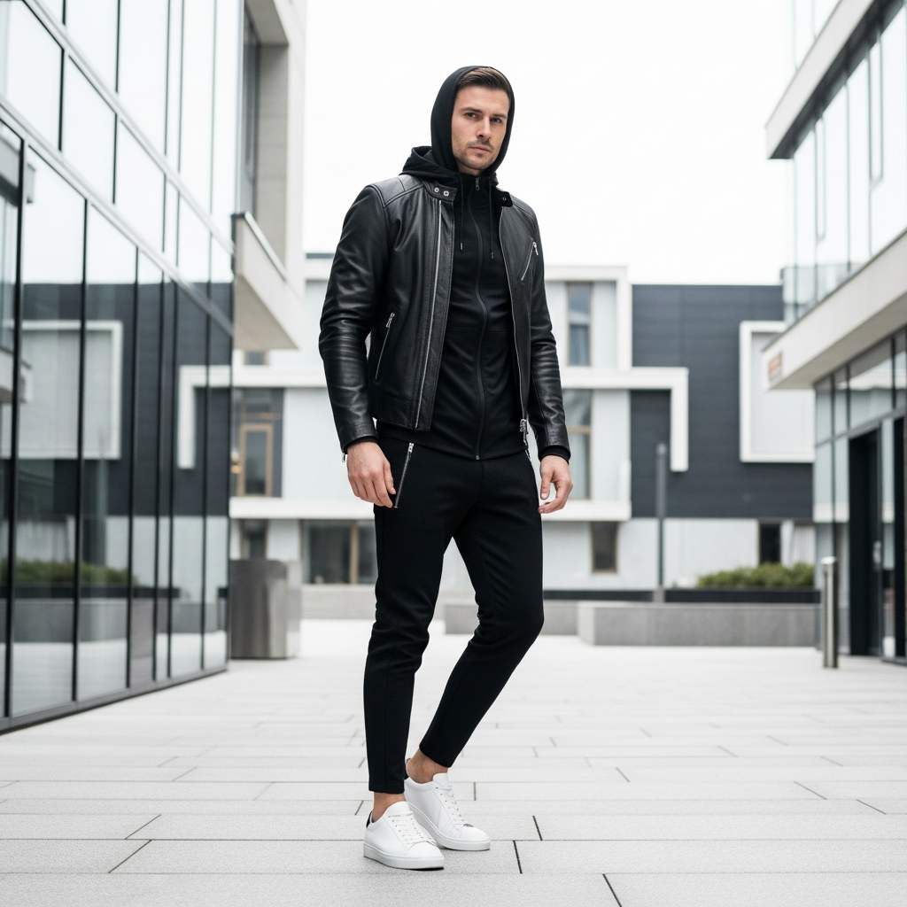A sleek black leather racer jacket over a fitted black hoodie, combined with black technical joggers and white leather sneakers. This contemporary fusion of leather outerwear with athletic-inspired pieces creates modern urban style that bridges multiple aesthetics.