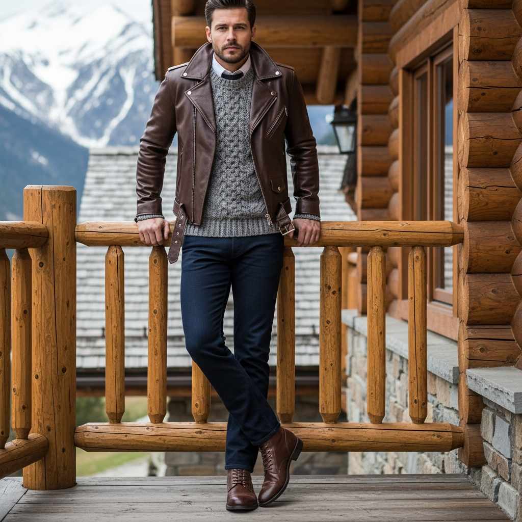 Textured Layering: This outfit showcases advanced layering techniques where multiple textures—leather, knit, cotton, denim—work together harmoniously. The brown leather’s warmth complements rather than contrasts with the gray and navy base.