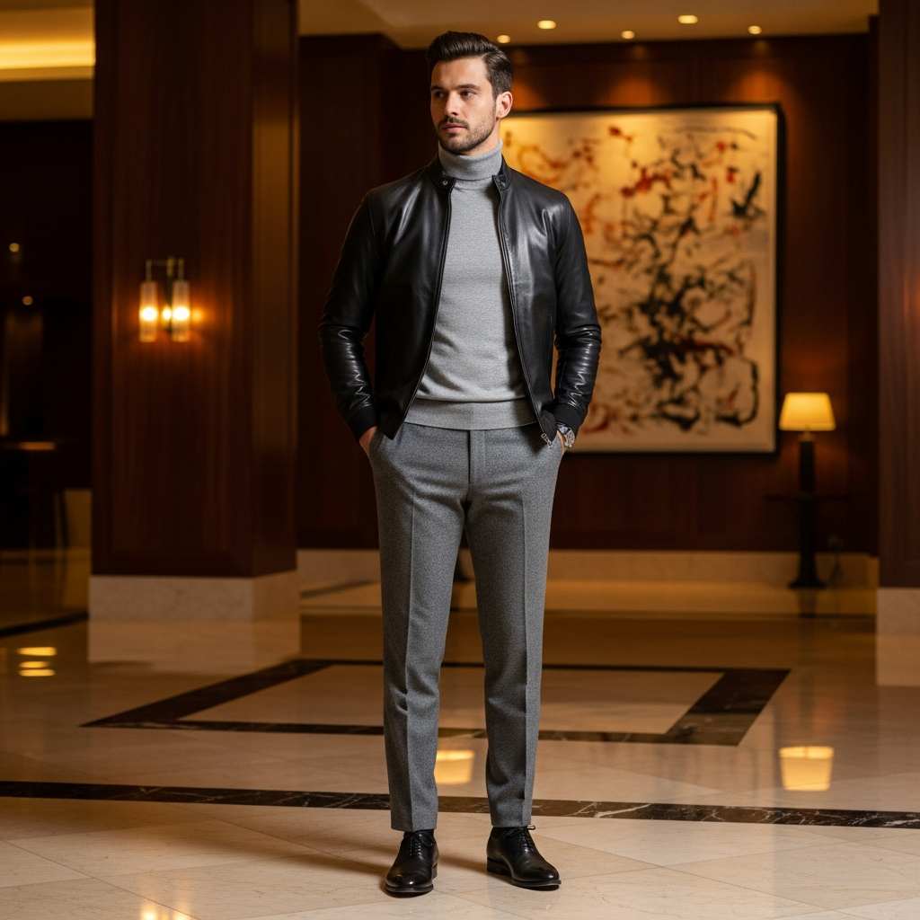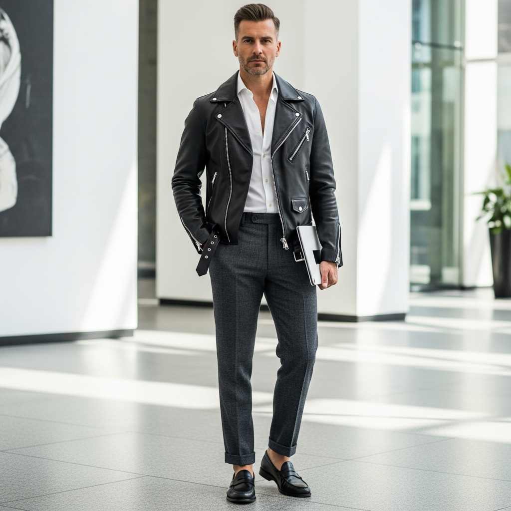 A black leather motorcycle jacket paired unexpectedly with charcoal flannel dress trousers and black leather loafers. Add a white dress shirt with the top button undone. This high-low mix demonstrates how leather jackets elevate into smart-casual territory when paired with tailored pieces.