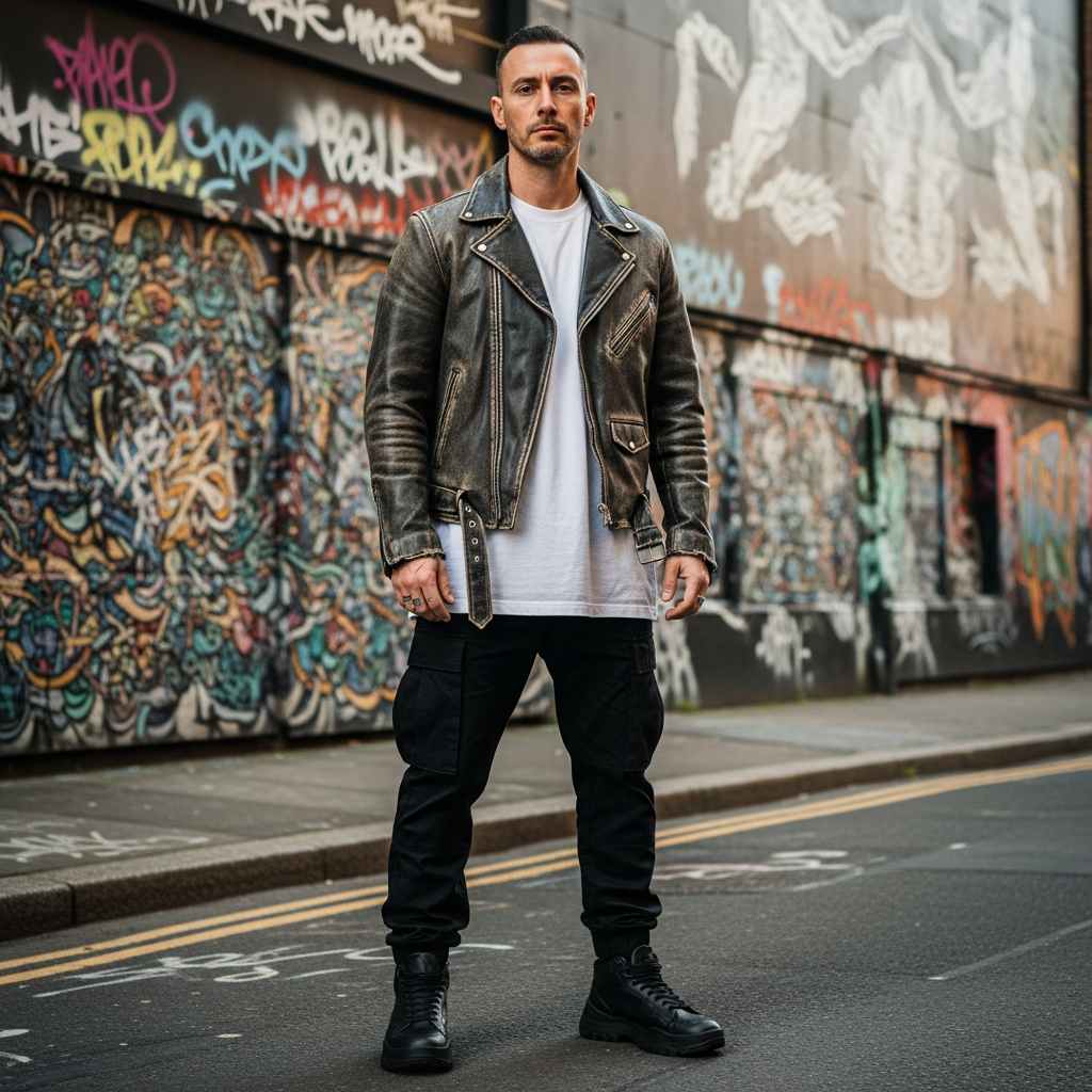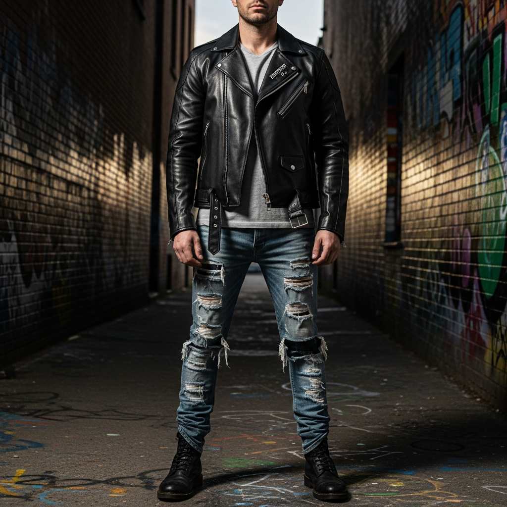The iconic Perfecto-style motorcycle jacket in black leather paired with heavily distressed light-wash jeans and black combat boots. A simple gray t-shirt underneath keeps the focus on the jacket’s aggressive hardware and the jeans’ distressing. This punk-influenced look embraces controlled chaos.