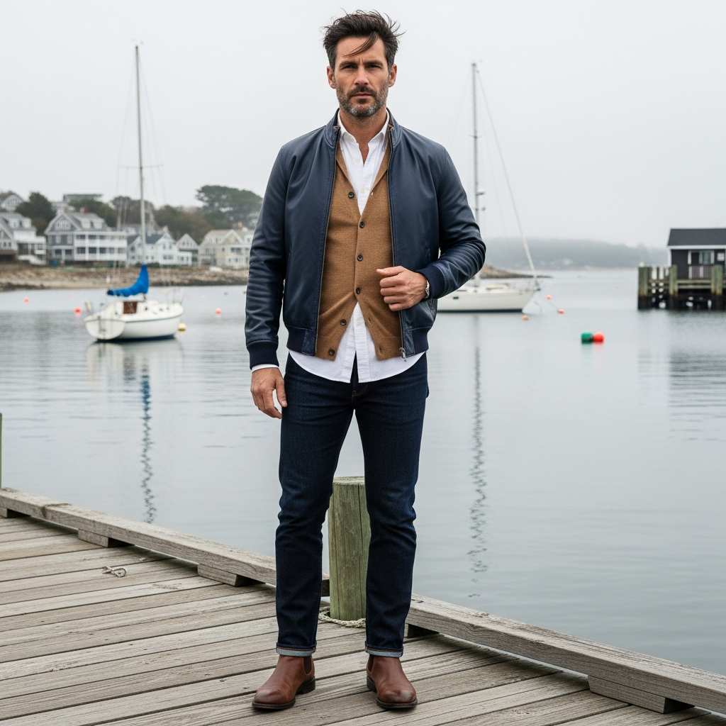 A navy blue leather jacket—an uncommon but sophisticated choice—over a white oxford shirt and camel-colored knit vest, paired with dark denim and brown leather boots. The navy leather provides unexpected richness while the layering creates visual interest.