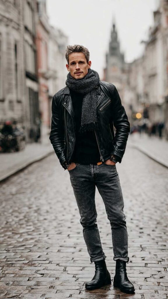 A black leather racer jacket over a black crewneck sweater, paired with charcoal jeans and black boots, elevated with a camel or gray wool scarf casually wrapped around the neck. The scarf adds European sophistication and practical warmth while introducing color contrast.