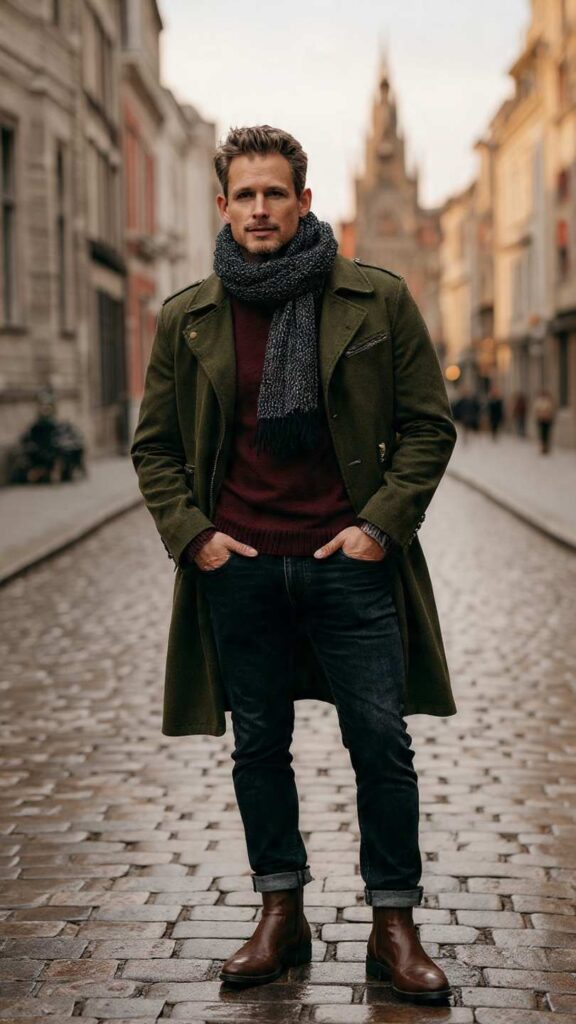 Accessory Enhancement: The addition of a quality scarf transforms a basic outfit into something more considered and refined. This technique adds visual interest at the neckline while demonstrating attention to detail and Continental style influences.