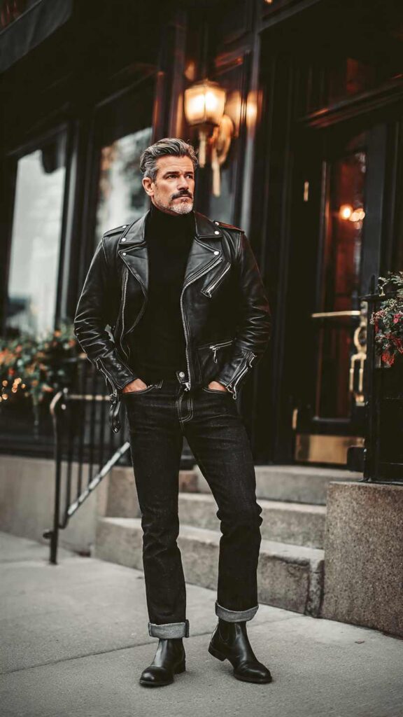 Refined Rebellion: By pairing the Perfecto with sophisticated pieces—turtleneck, quality denim, dress boots—the outfit maintains edge while becoming appropriate for upscale casual contexts like nice restaurants or evening social events.