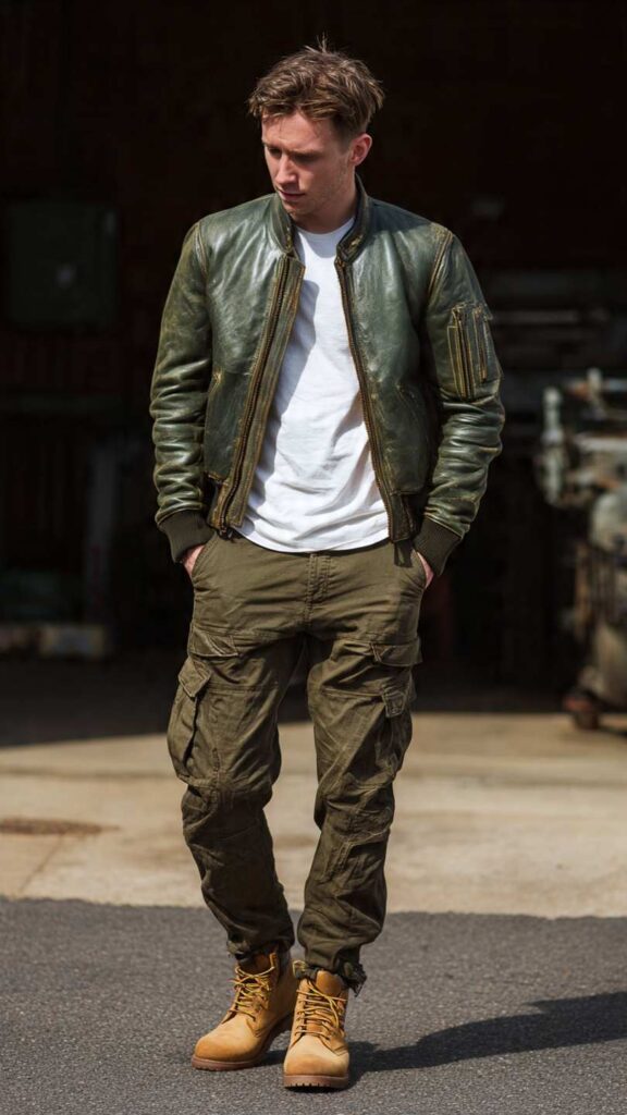 An olive green leather bomber jacket—a rare but striking choice—over a white t-shirt, paired with olive cargo pants and tan desert boots. This monochromatic military-inspired look creates cohesive visual impact while the varied olive shades add depth.