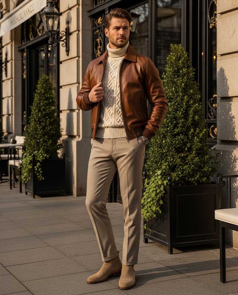 A cognac brown leather bomber jacket layered over a cream cable-knit turtleneck sweater, paired with beige chinos and tan suede Chelsea boots. This warm, monochromatic palette creates sophisticated elegance that works beautifully for autumn and winter social occasions.