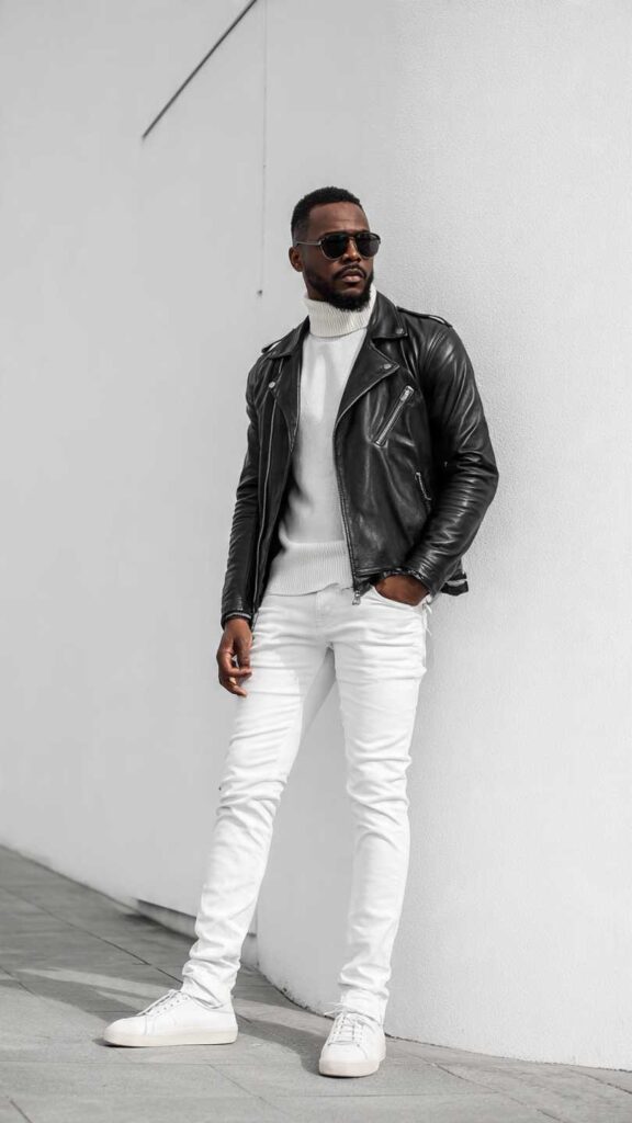 A black leather racer jacket over an all-white outfit—white turtleneck or t-shirt, white jeans, and white leather sneakers. This high-contrast combination creates striking visual impact and demonstrates confident styling that defies conventional color rules.