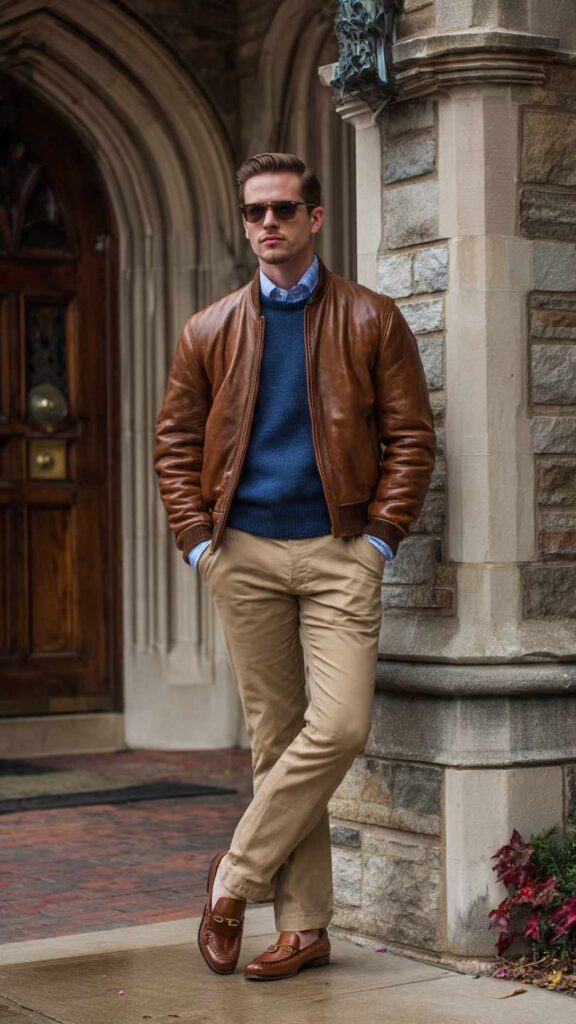A cognac brown leather jacket over a light blue oxford button-down shirt and navy crewneck sweater, paired with khaki chinos and brown leather loafers. This preppy-meets-rugged combination balances polish with edge, creating accessible sophistication.