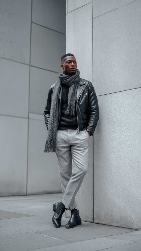 A black leather motorcycle jacket over various shades of gray—charcoal sweater, medium gray scarf, and light gray trousers—with black leather boots. This tonal gray outfit with black leather accents creates refined urban sophistication.