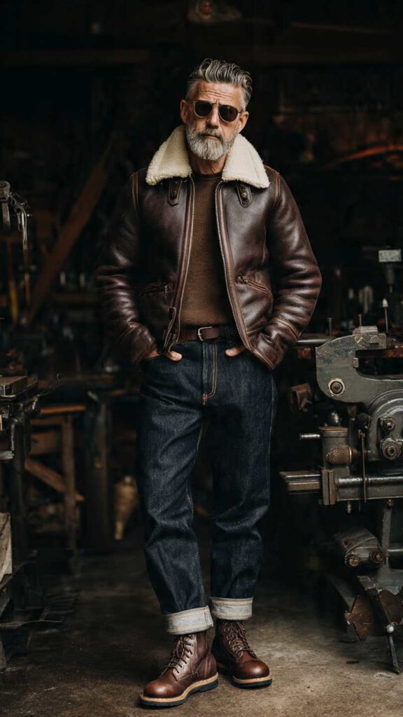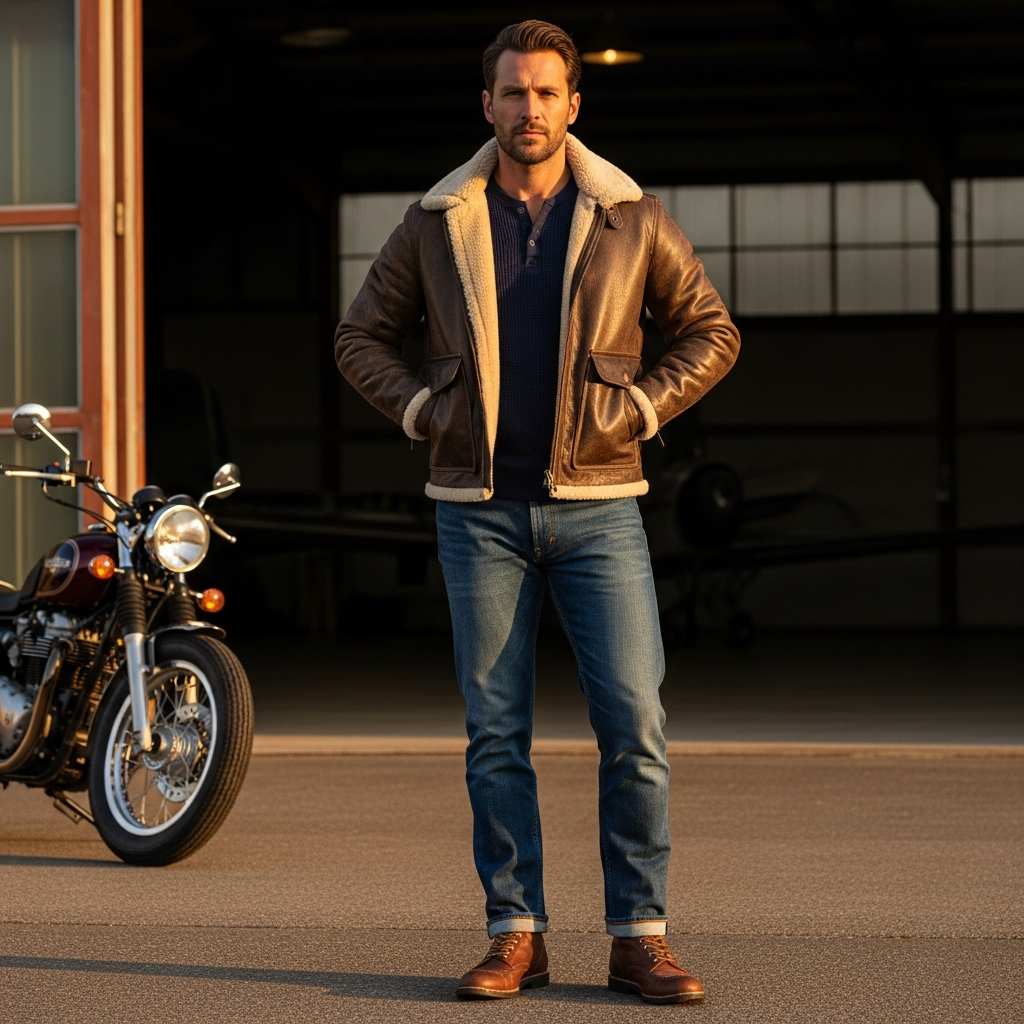 A distressed brown aviator jacket with shearling collar worn over a navy blue henley, combined with medium-wash denim jeans and brown leather work boots. This heritage-inspired look channels 1940s military aviation while feeling completely authentic for contemporary wear.