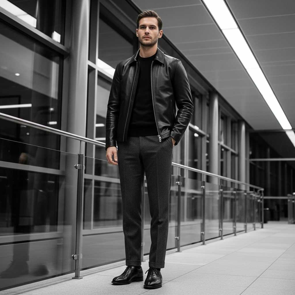 A sleek black leather racer jacket with minimal hardware over a black merino crewneck sweater, paired with charcoal wool trousers and black leather dress shoes. This monochromatic approach creates streamlined sophistication suitable for creative professional environments or upscale casual events.