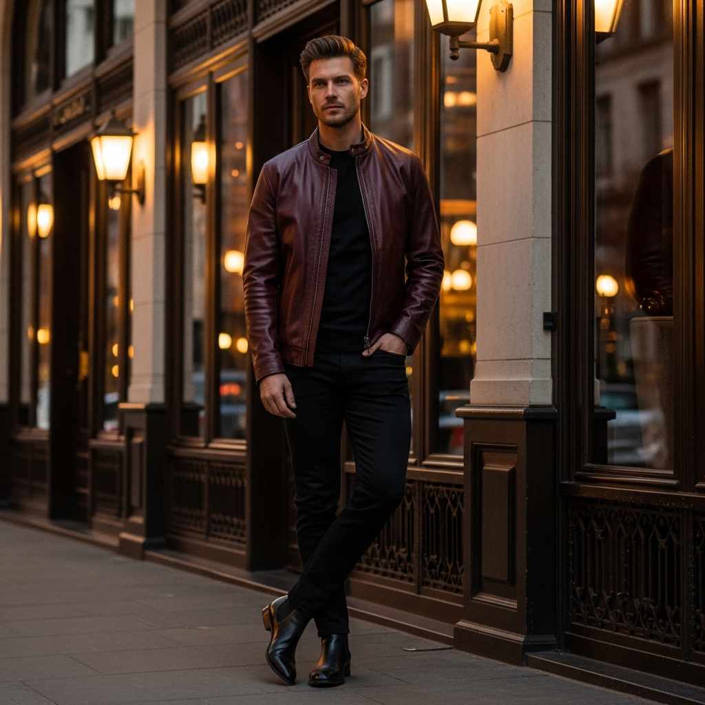 A rich burgundy or oxblood leather jacket in bomber or racer style over an all-black outfit—black t-shirt, black jeans, and black Chelsea boots. The colored leather provides a sophisticated focal point while the black base keeps the look grounded and wearable.