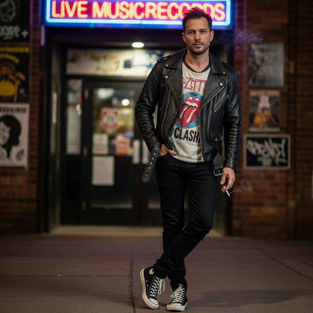 A classic black double rider motorcycle jacket worn over a vintage band t-shirt or graphic tee, paired with black skinny or slim jeans and high-top sneakers. This rock-and-roll inspired look embraces music subculture while remaining accessible for everyday wear.