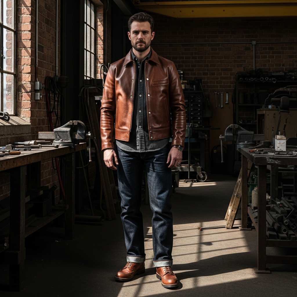A medium brown café racer leather jacket over a charcoal chambray work shirt, paired with dark indigo selvedge denim and brown leather work boots. Add a simple leather watch strap for cohesive accessorizing. This working-class heritage look celebrates honest craftsmanship and durable materials.