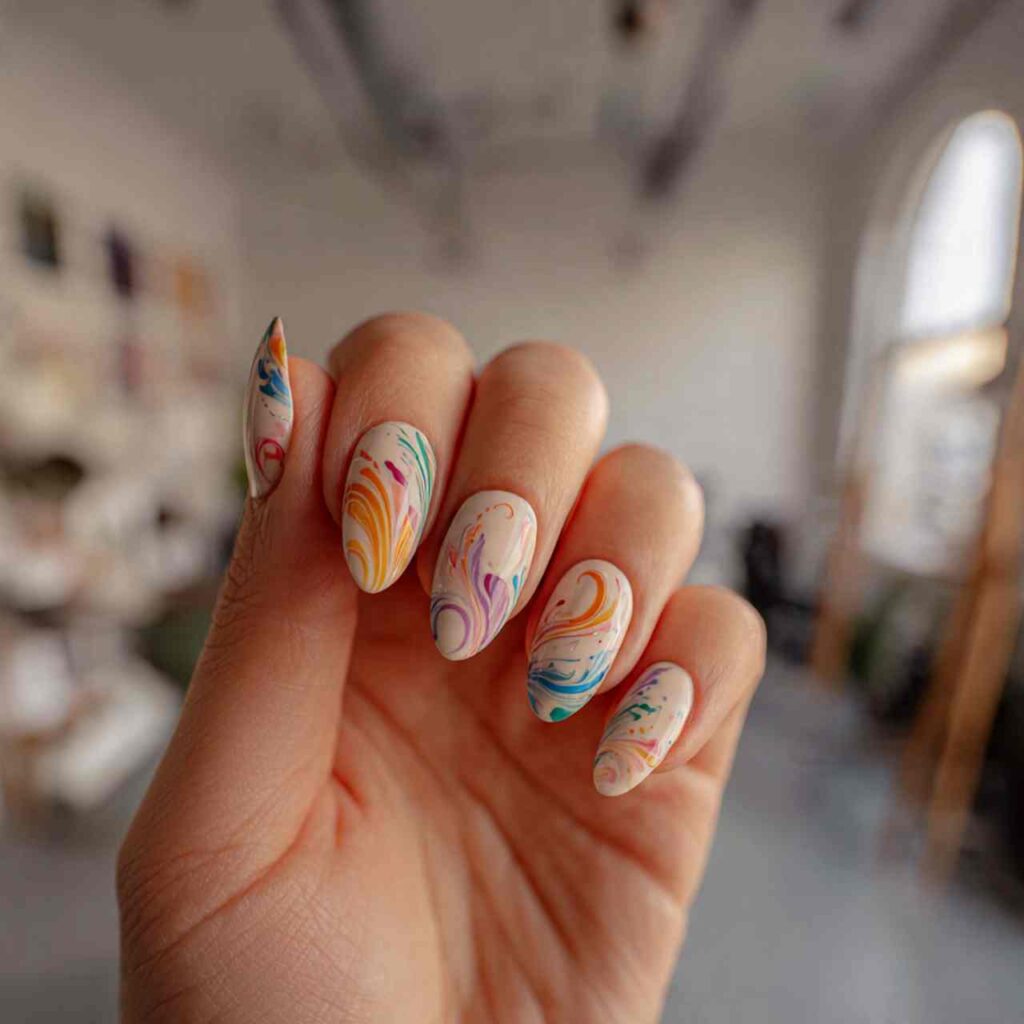 Cream base featuring abstract swirled patterns in soft pink, lavender, and blue creates artistic sophistication. The marbled effect adds visual interest while remaining cohesive.
