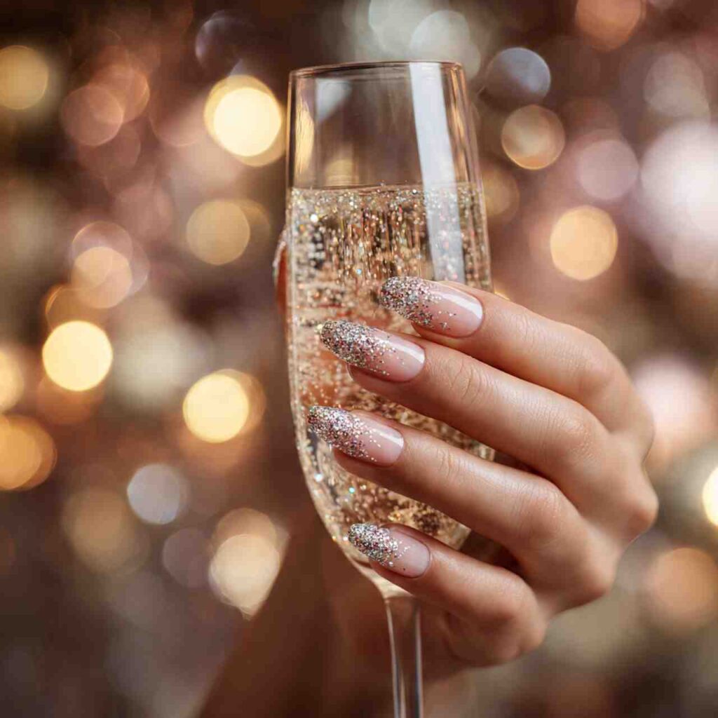 Clear or nude base with increasing glitter density from cuticle to tip creates sparkly ombrรฉ effect. The transparency keeps it fresh while the glitter adds celebration-ready glamour.