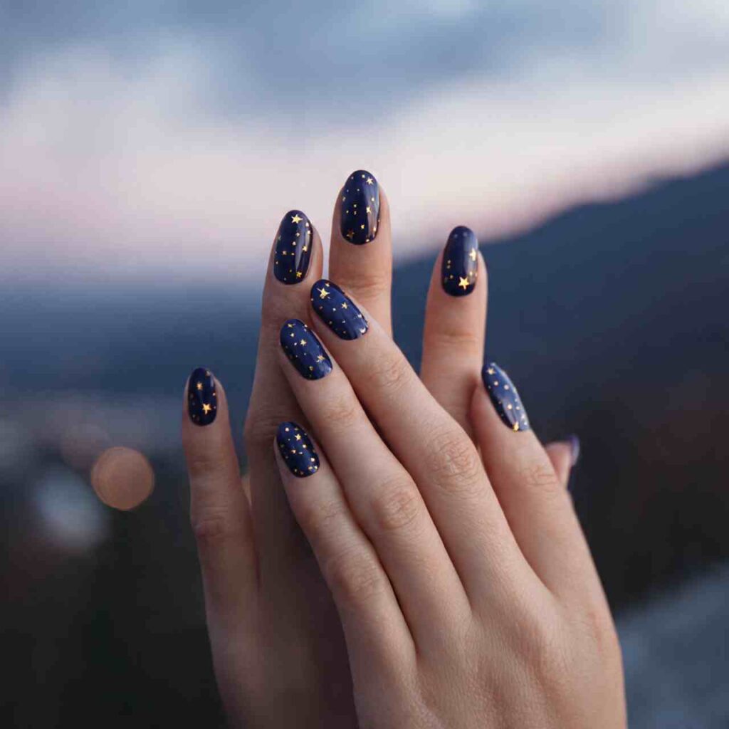 Deep navy base adorned with tiny gold star details creates celestial sophistication. The cosmic theme feels magical while the navy keeps it elegant and wearable.
